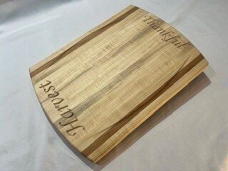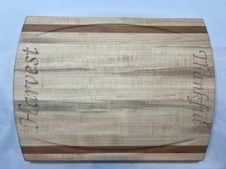 Hand crafted, from Michigan hardwoods. Edge grain board with arched ends having juice lines along with engraved “Harvest / Thankful”